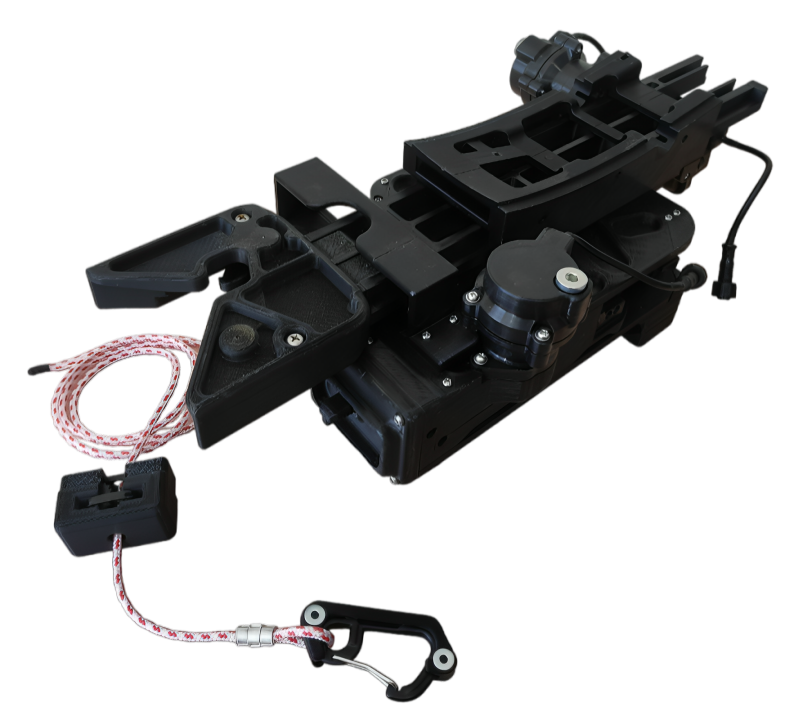 Robot especializado para reparación definitiva de redes loberas, mediante costura multi-punto con mosquetones resistentes y tensado controlado de cuerda.